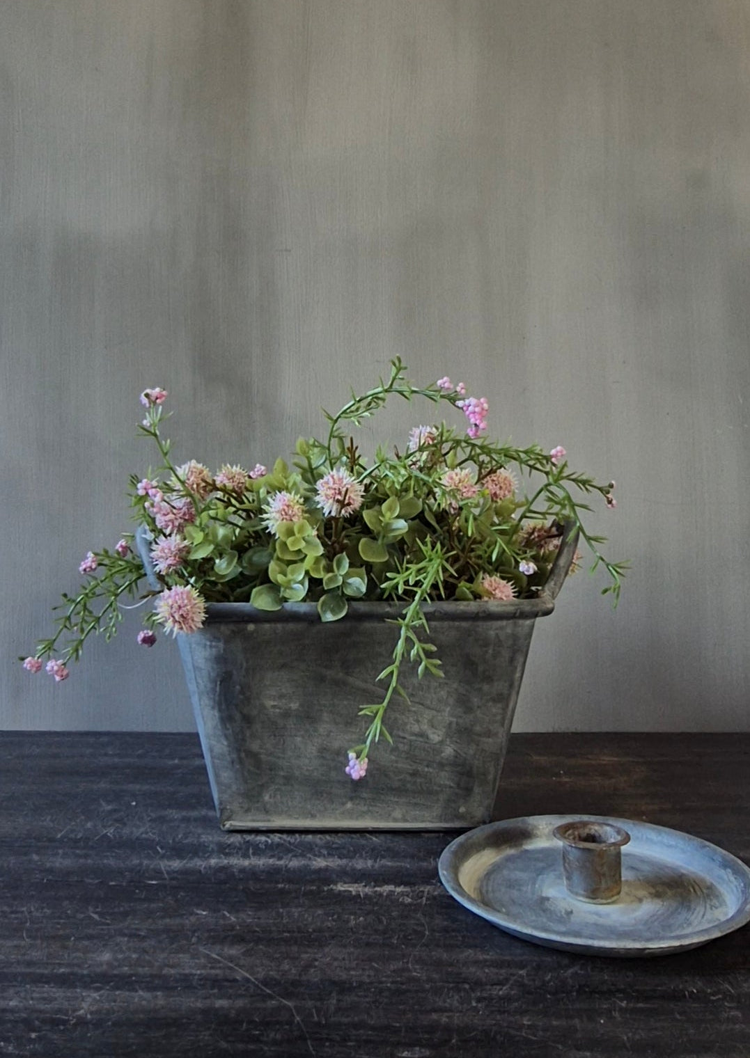 Set zinken pot - rond - met halve kunstbol en waxinelichthouder