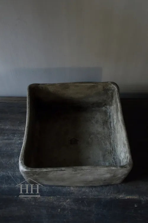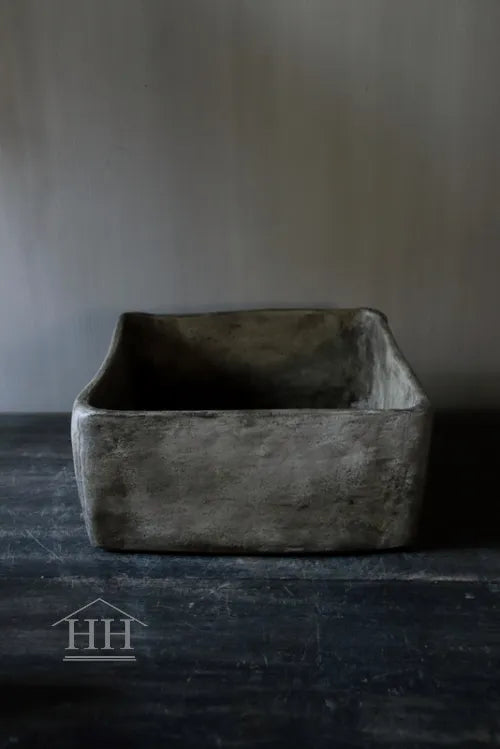 Een uniek vierkant betonnen bak naar eigen ontwerp in een taupe kleur. Deze bak heeft een afmeting van ongeveer 21-22x 21-22 cm en is ongeveer 10cm hoog. De bak heeft een doorleefde en imperfecte uitstraling door het materiaal gebruik.