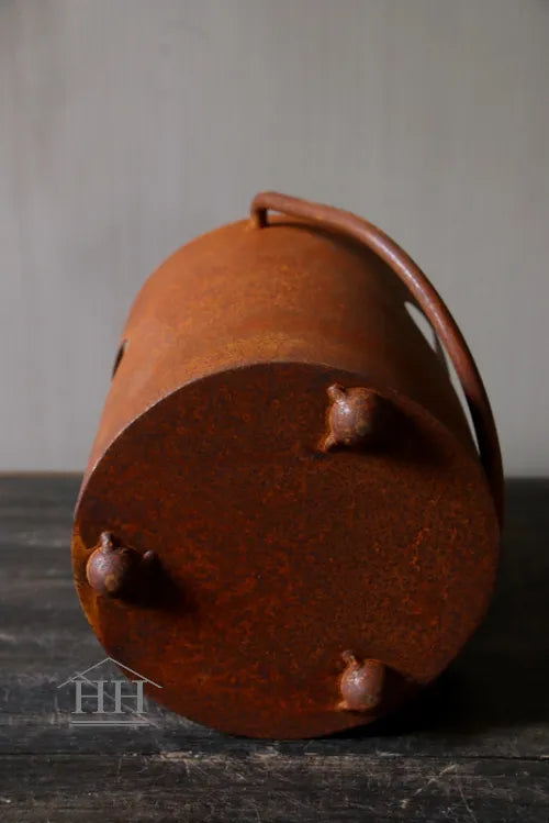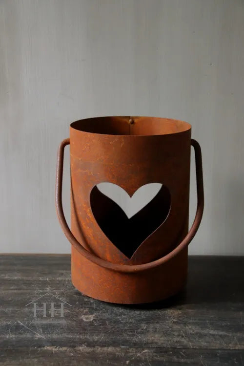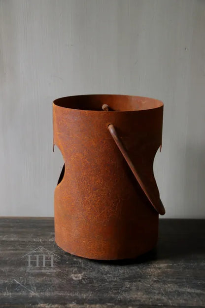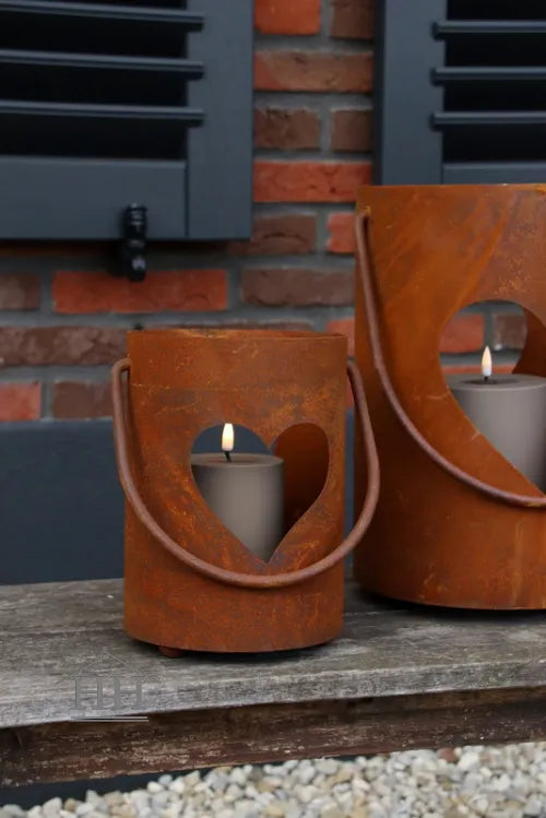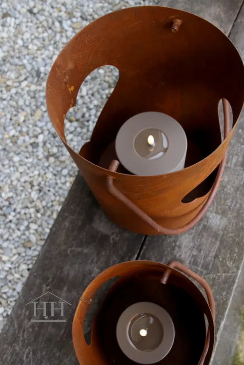 Een roestig metalen windlicht in het rond met een diameter van 15cm en een hoogte van 20 cm (zonder het hengsel gemeten).