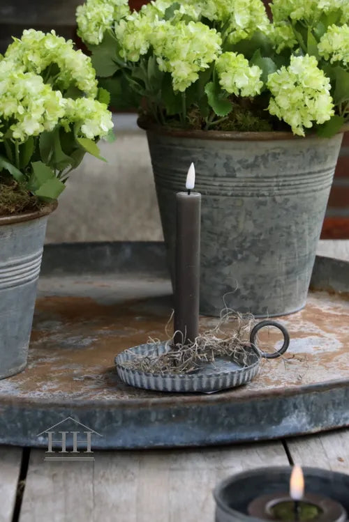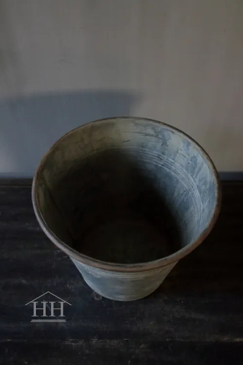 Een ronde zinken pot met een hoogte van 20cm, een diameter op z'n breedst van 22cm. De opening van de hals heeft een diameter van 20,5 cm.