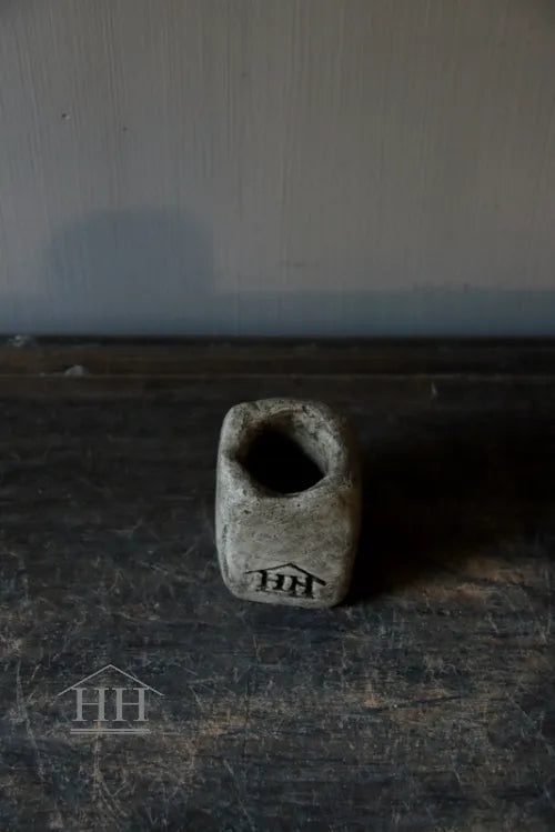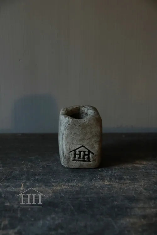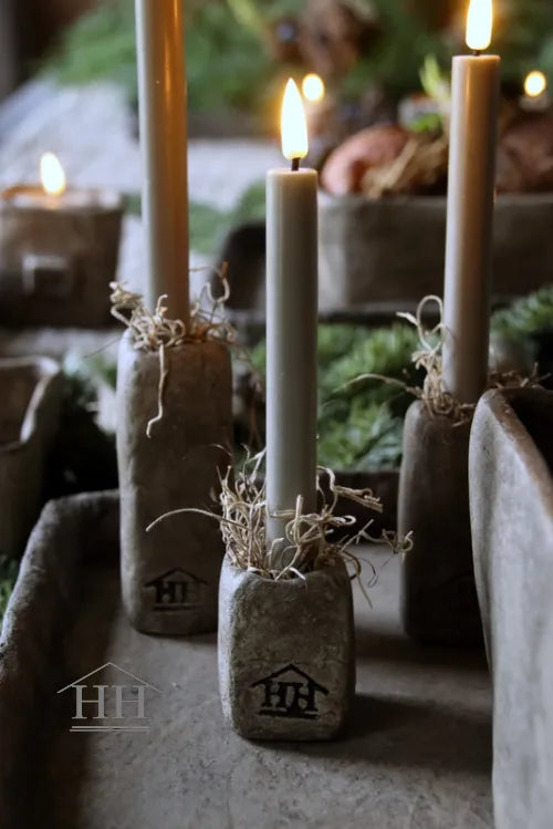 Een vierkante kandelaar van beton die mooi past bij de gehele betonnen kandelaarcollectie. De kandelaar is ongeveer 5cm hoog en 4cm breed. Er past een dinerkaars in de kandelaar.