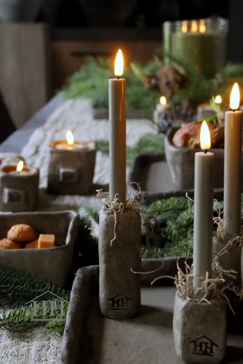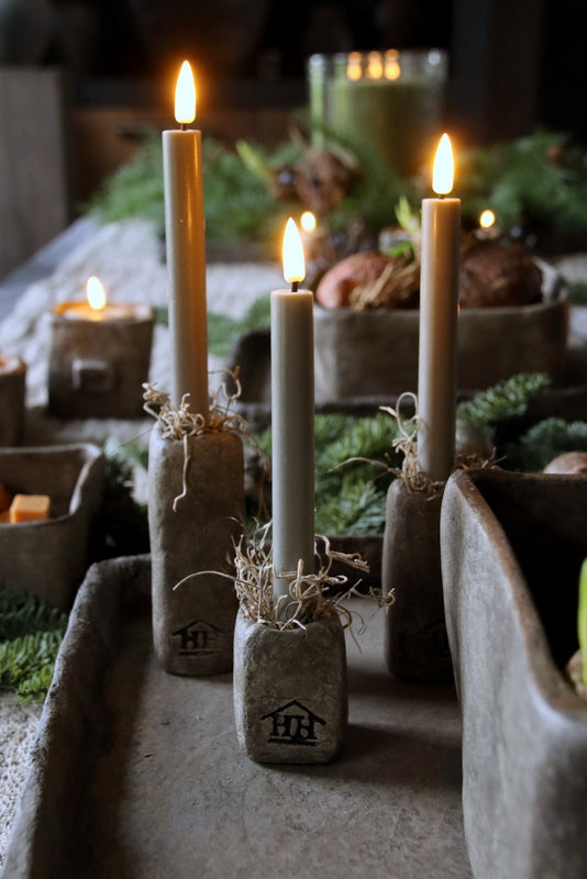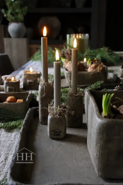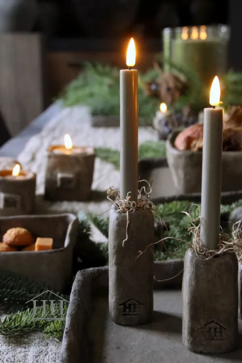 Een vierkante kandelaar van beton die mooi past bij de gehele betonnen kandelaarcollectie. De kandelaar is ongeveer 10cm hoog en 4cm breed. Er past een gewone dinerkaars in, maar ook de kerstboom kaarsjes zoals op de foto. Om die stevig vast te zetten is de opening gevuld met tillandsia. Op die manier zet je de kandelaar stevig en stabiel neer.