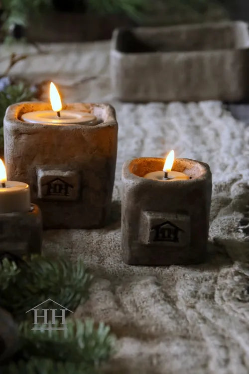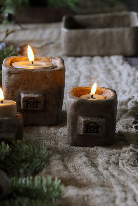In deze betonnen theelichthouder past perfect een theelichtje in. Uiteraard kunnen er ook LED theelichtjes in zoals die van Deluxe Homeart.