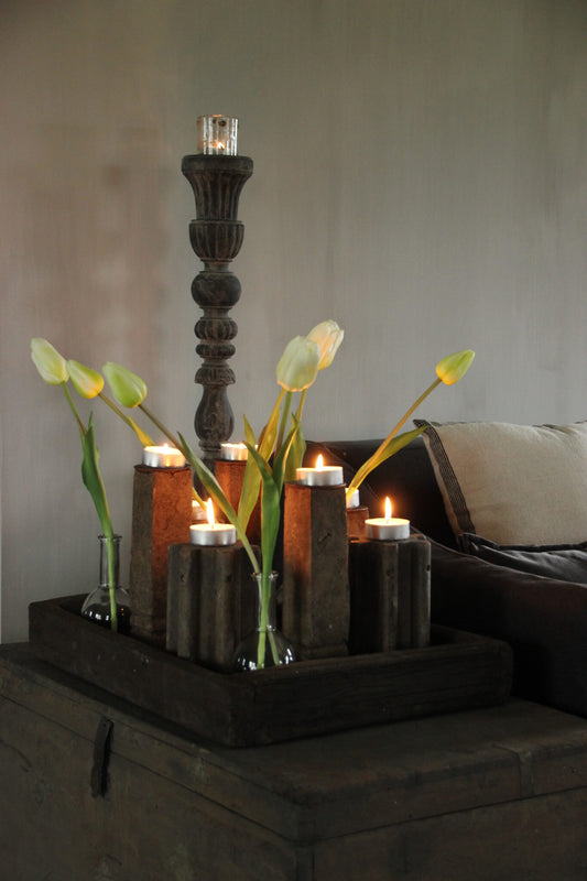 Kandelaren van hout of beton. Landelijke kandelaren zijn niet alleen functioneel, maar ook prachtige decoratieve stukken. Kandelaren zijn verkrijgbaar van merken zoals Aura Peeperkorn en Gommaire. De houten kandelaars zijn perfect voor in een interieur in landelijke stijl.