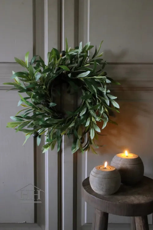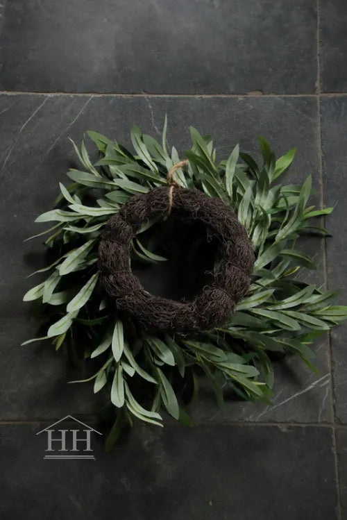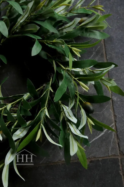 Een krans van groene kunst olijftakken op een bruine basiskrans.