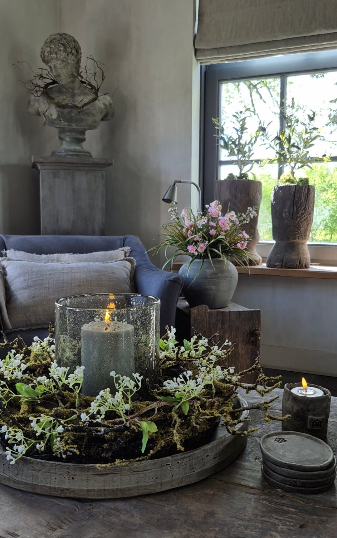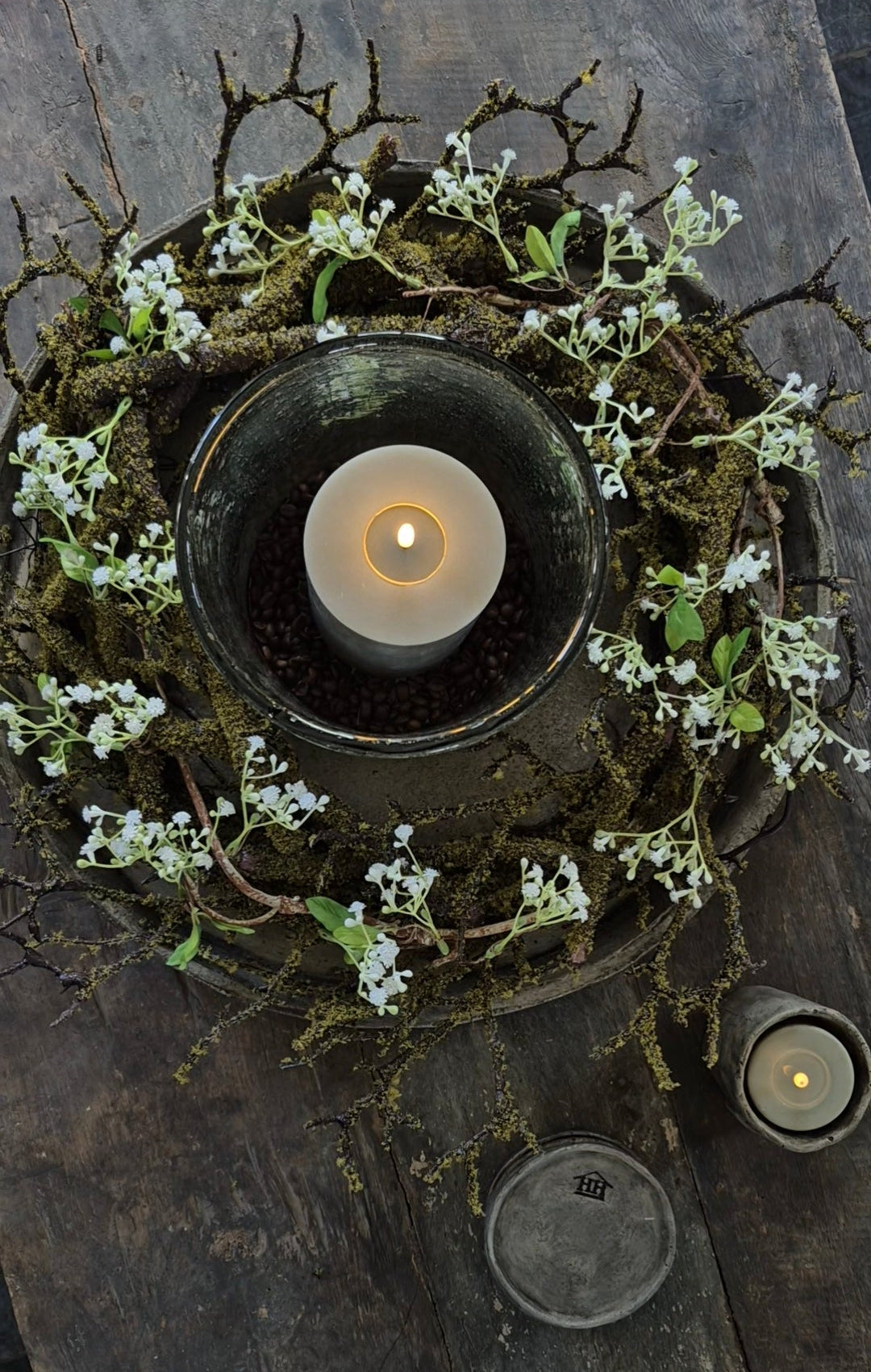 Levering: enkel de krans zoals de 3e foto (schaal en windlicht 19/23 worden niet meegeleverd, deze zijn wel in de webshop erbij te bestellen).