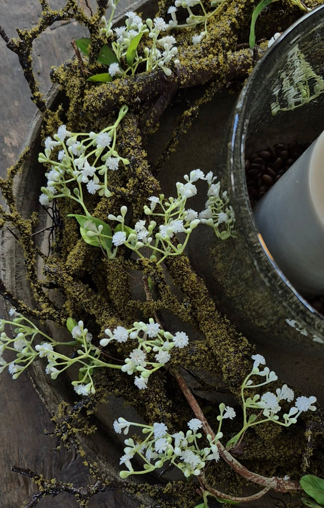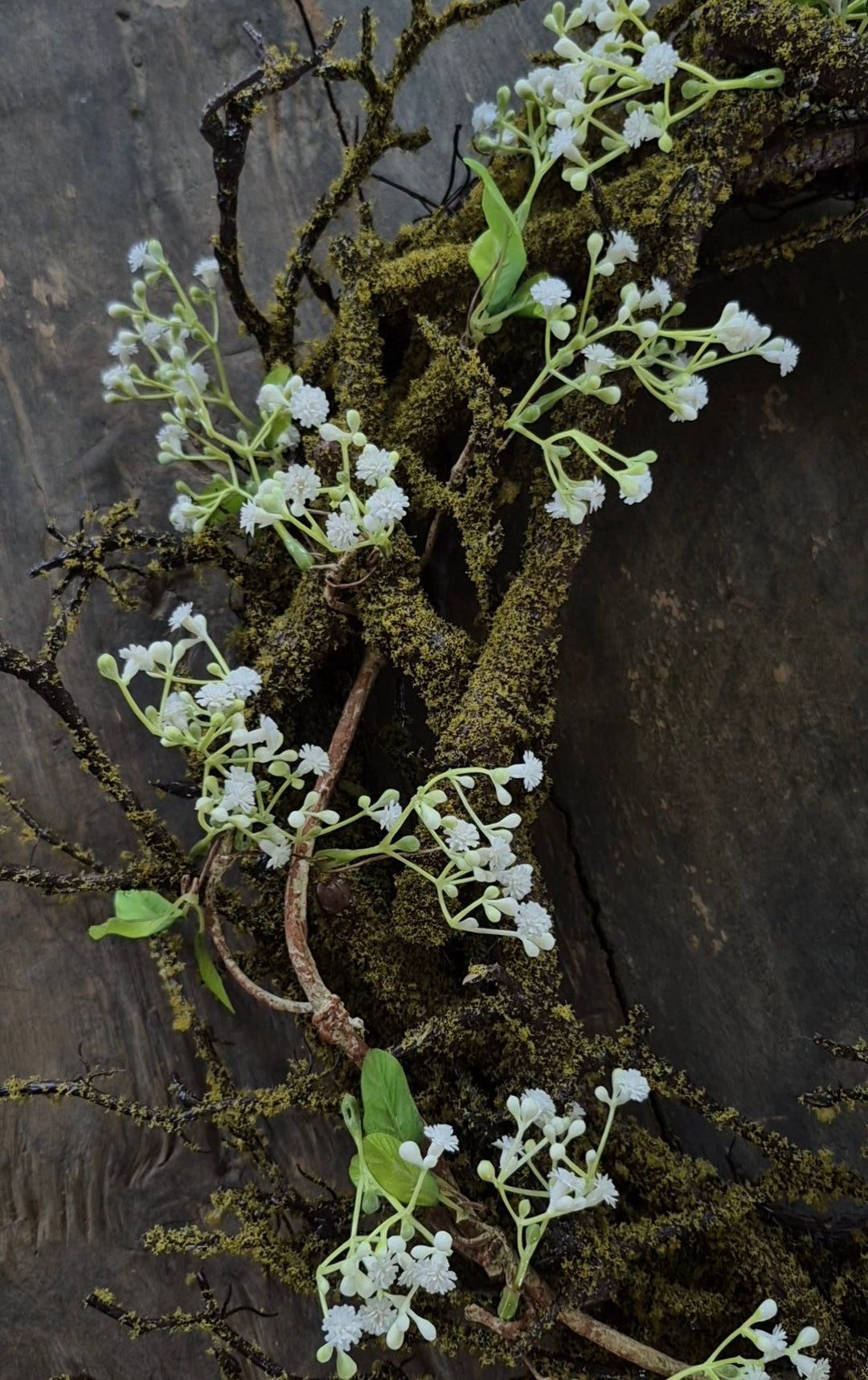 Kunst moskrans met witte gipskruid