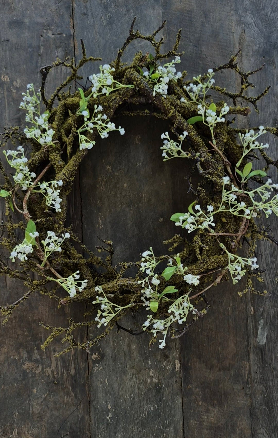 Deze kunst moskrans heeft grove takken en is gestyled met witte gipskruid. De krans heeft een diameter van 40-42cm. Met de uitlopers erbij is de krans 50-55cm.