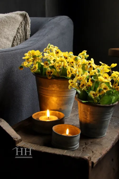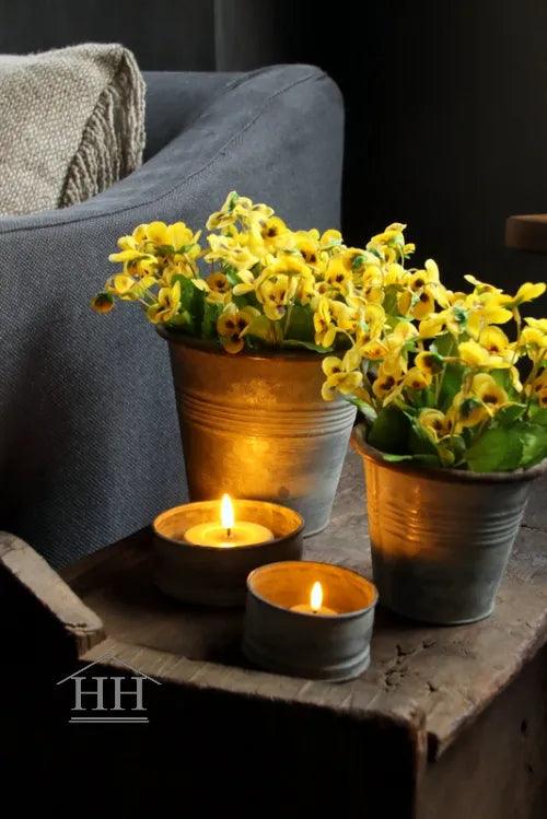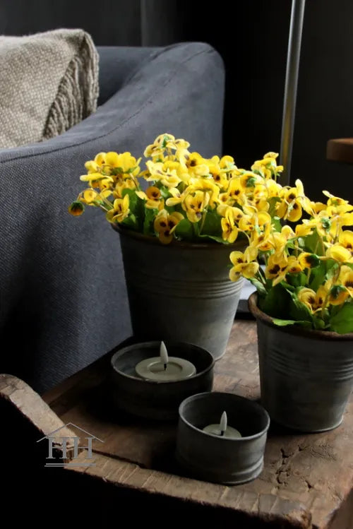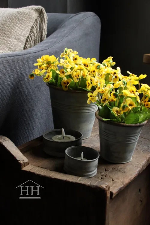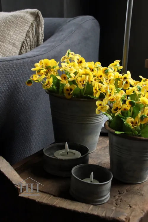 - Levering: 1 bosje met viooltjes zoals foto 1,2 en 3. Ze gaan per stuk. (op de sfeerfoto's zitten er 3 en 2 bosjes in per zinken potje, dit alles wordt er niet bijgeleverd)