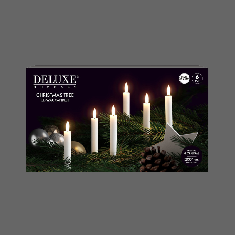 Deze clipkaarsjes wit van Deluxe Homeart zijn ideaal voor het creëren van warme, realistische kerstverlichting in je boom of groene decoraties. De set bestaat uit 6 witte LED-kaarsjes met donkergroene clip, zodat ze stevig én subtiel tussen de takken blijven zitten. De kaarsjes hebben een realistische vlam en een brandtijd van meer dan 200 uur.