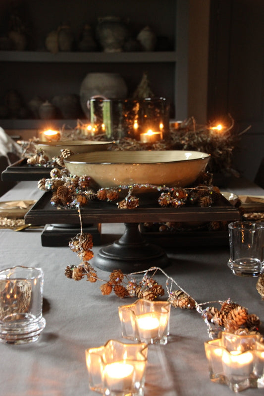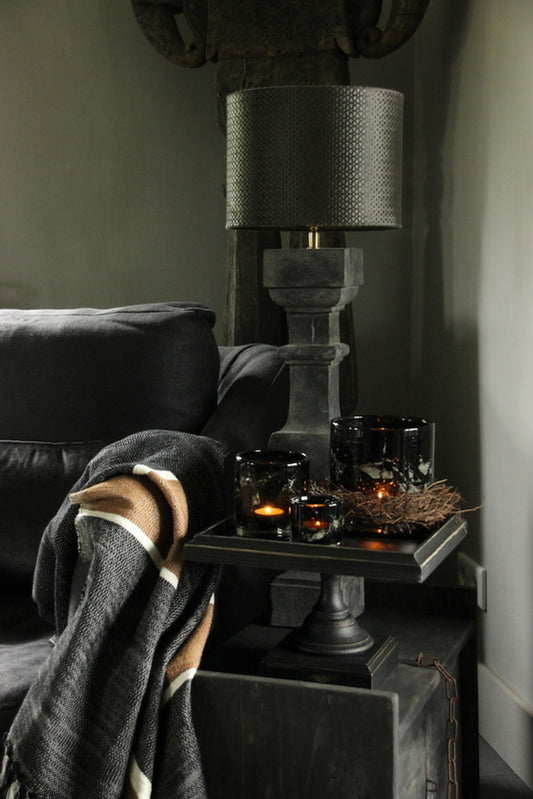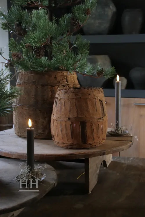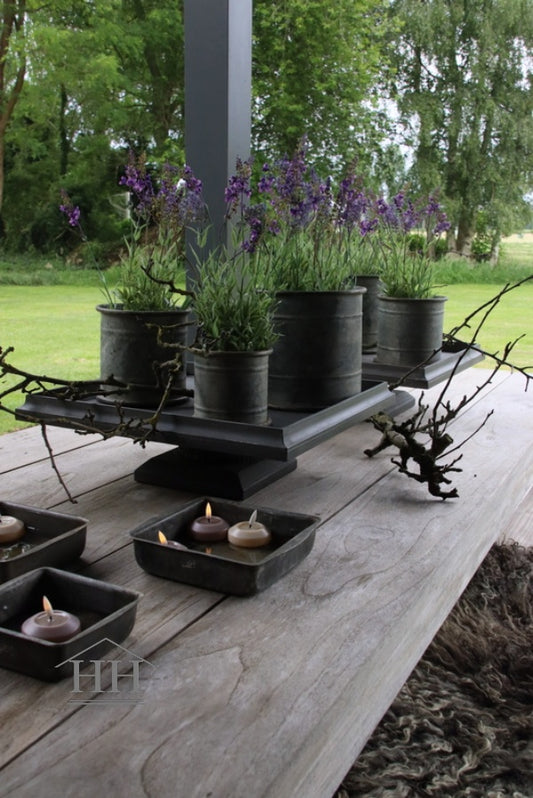 Gebruik een landelijke plateau om jouw favoriete decoratieve items, zoals LED kaarsen, vazen en planten, op een stoere manier te presenteren.