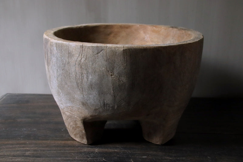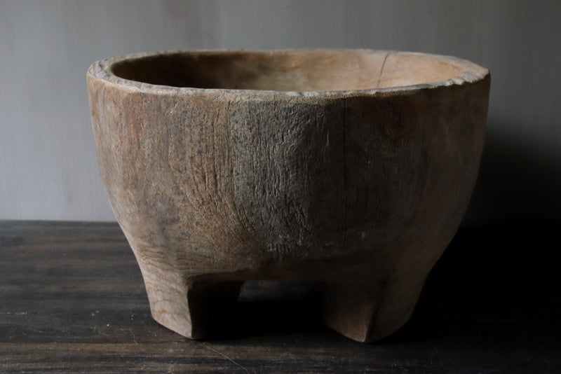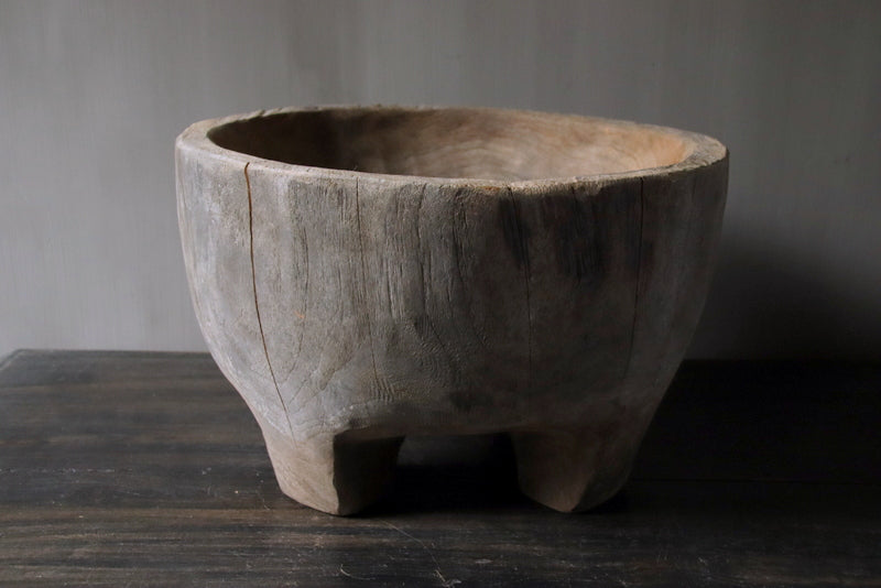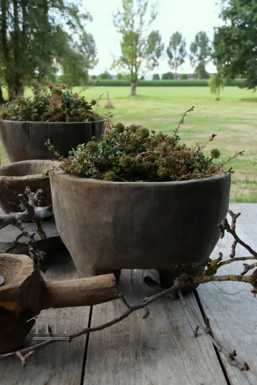 Een vergrijsde massieve pot op 4 pootjes van Luksa met een diameter van ongeveer 37,5cm op z'n breedst.