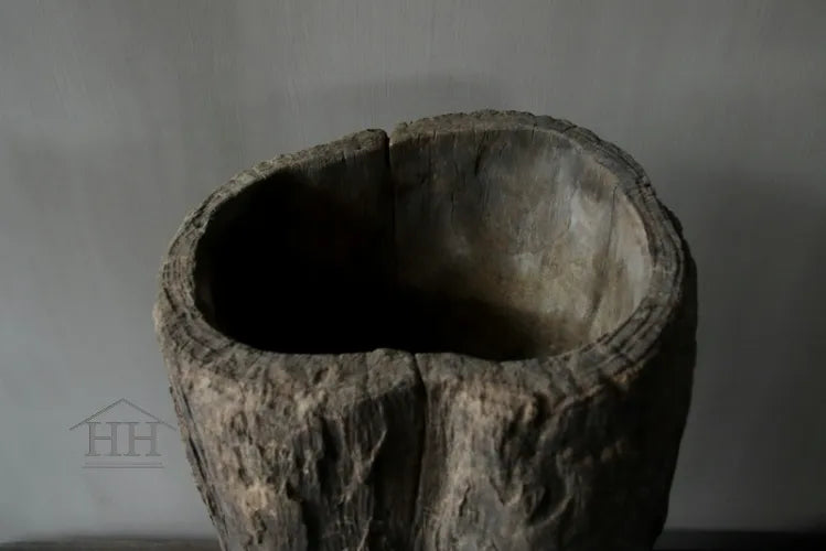Een vergrijsde vijzel van Luksa met een diameter van ongeveer 24 cm op het breedst bovenaan en 26 cm op het breedst onderaan.
