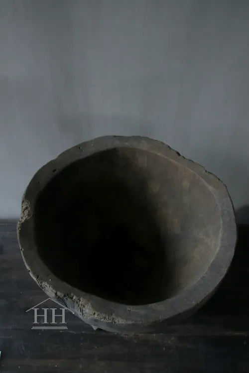 Een vergrijsde vijzel / pot Rahayu van Luksa met een diameter van ongeveer 31 cm op z'n breedst.