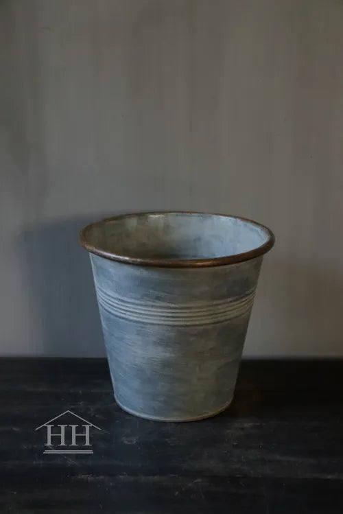 Een ronde zinken pot met een hoogte van 18cm, een diameter op z'n breedst van 20cm. De opening van de hals heeft een diameter van 18 cm.