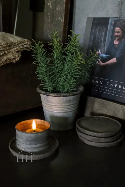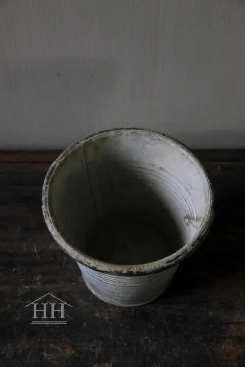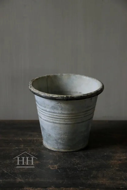 Een ronde zinken pot met een hoogte van 11cm, een diameter op z'n breedst van 12,5cm. De opening van de hals heeft een diameter van 11 cm.