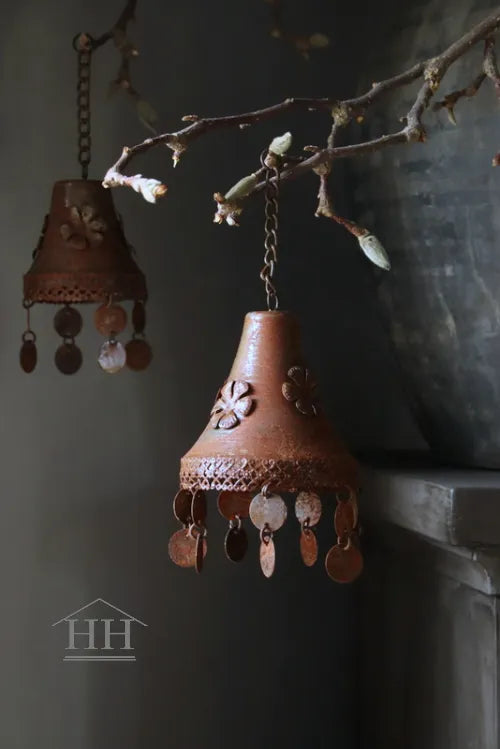 Een roestige metalen bel met mooie versiersels met een diameter van ongeveer 9cm. De bel is ongeveer 9,5cm hoog en de versiersels daaronder zijn ongeveer 4cm lang, dus in totaal ongeveer 13,5cm.
