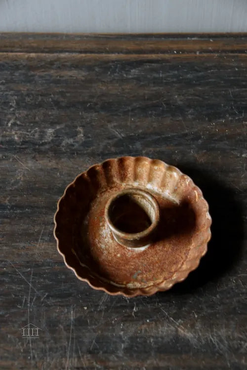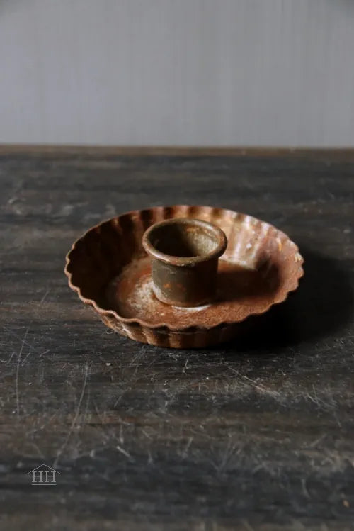 Een rond zinken kandelaartje in roest met een gekartelde rand met een diameter van 8cm. De opstaande rand is 1cm hoog.