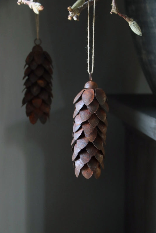 Een roestige metalen dennenappel met een lengte van ongeveer 13cm in totaal en een diameter van 5cm. Er zit een smal touwtje aan waar je de dennenappel aan kan ophangen.
