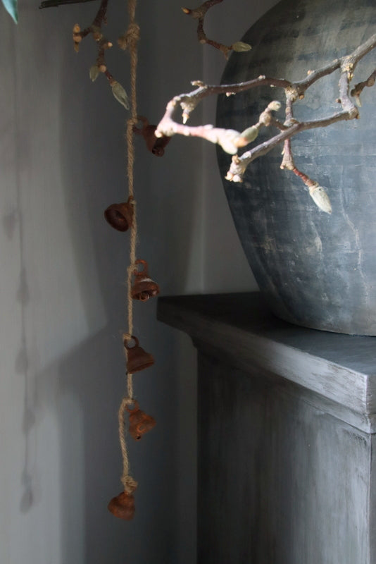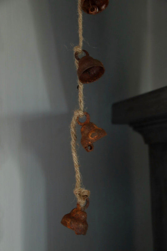 Roestige metalen belletjes aan een touw met een lengte van ongeveer 45-50cm. De belletjes zijn 2,5x2cm.