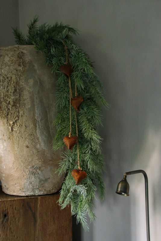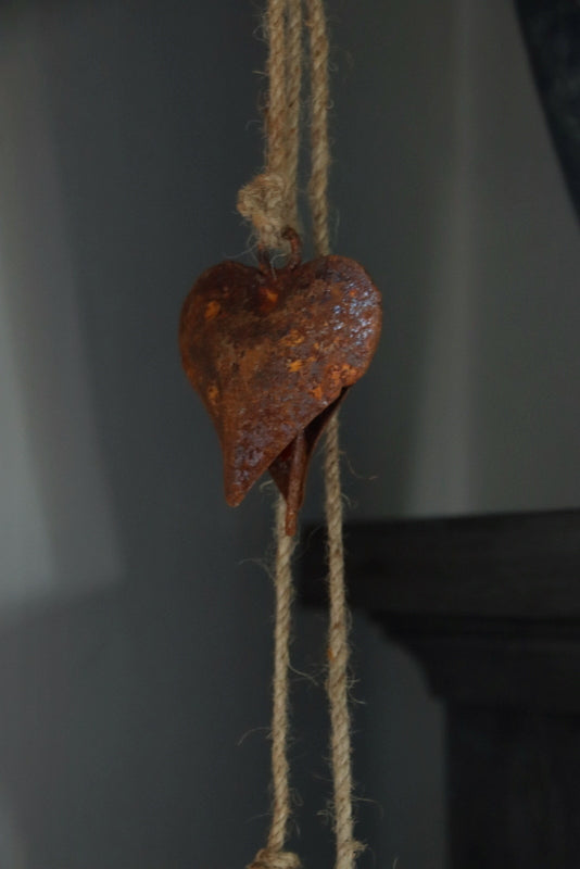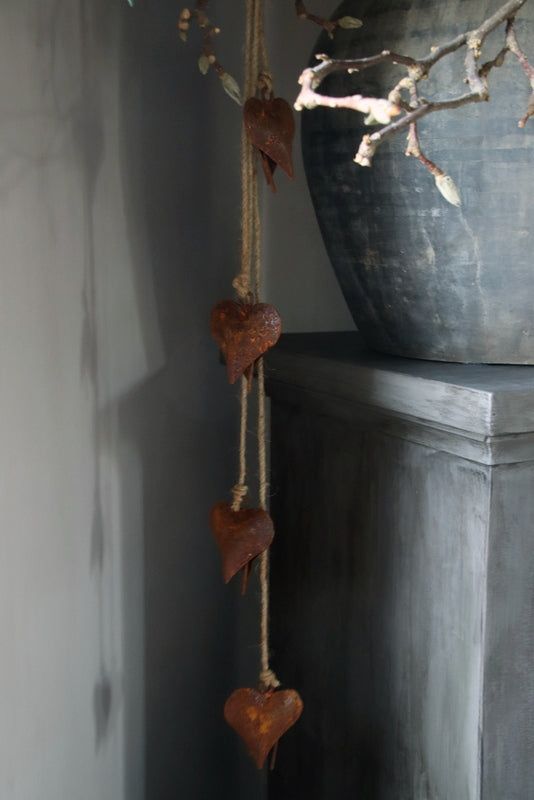 4 roestige metalen hartjes aan een touw met een lengte van ongeveer 70cm. De hartjes zijn 6x7cm.