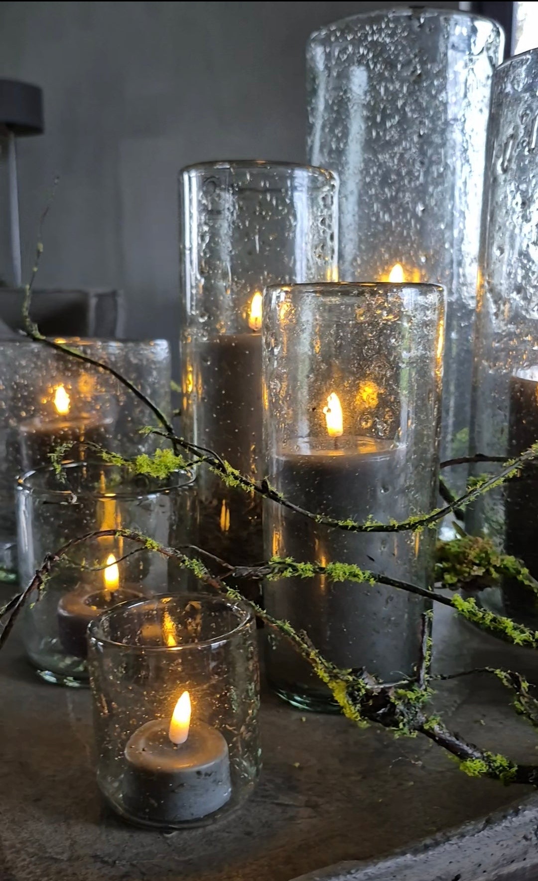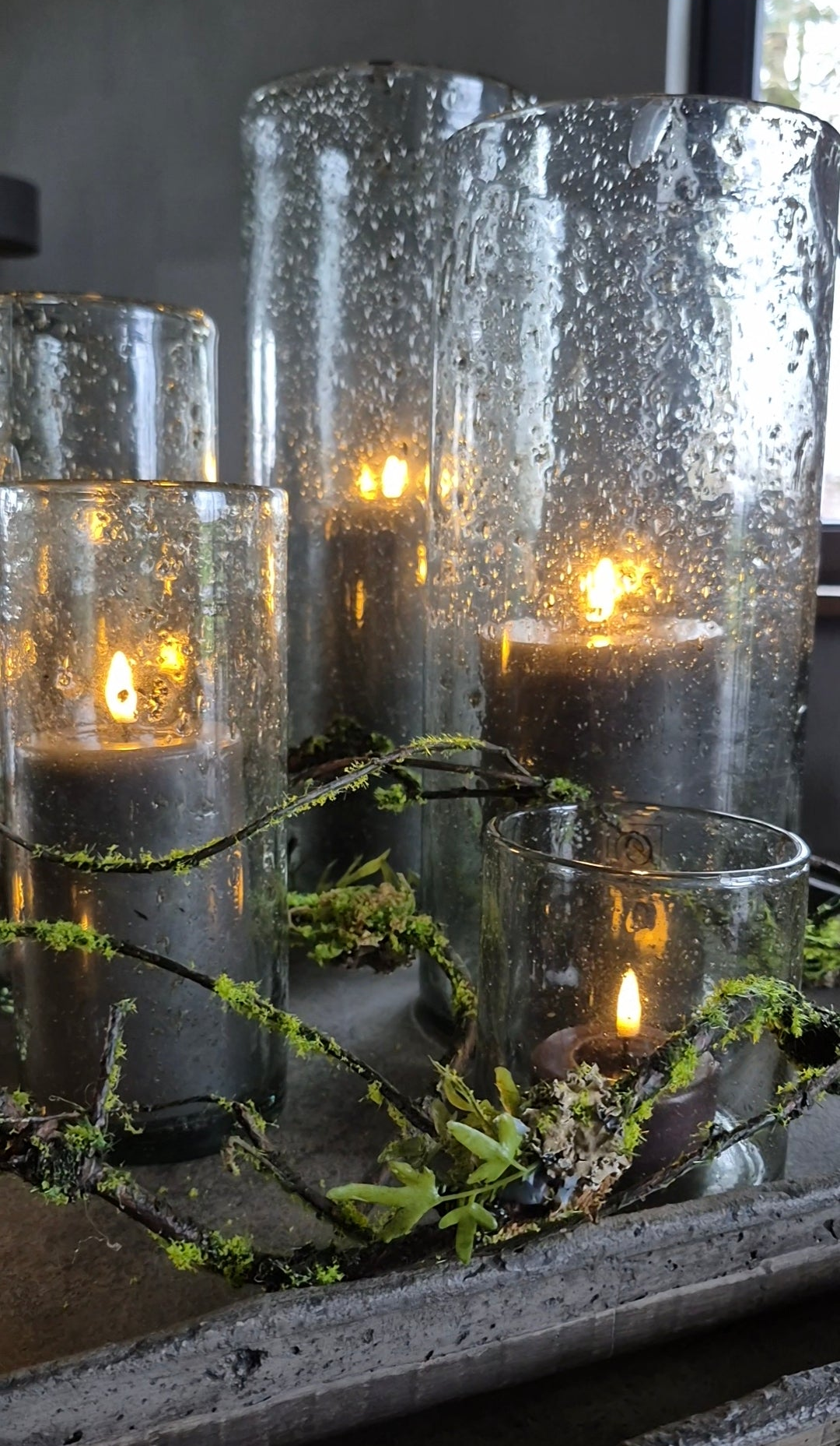 Een smal en hoog windlicht met metalen schilfers met een diameter van 10cm en 29cm hoog.