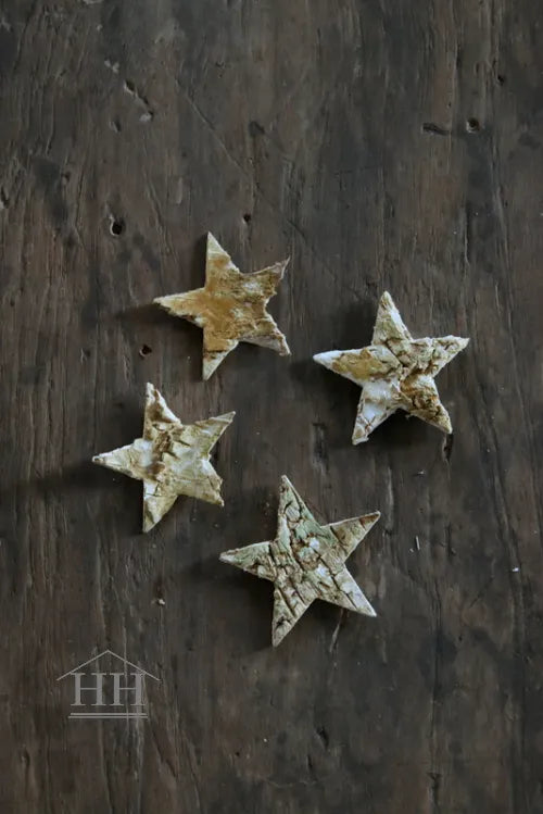 Een doosje met ongeveer 60-70 kleine bruine berkensterren met een diameter van ongeveer 4 cm. Soms zit er een vleugje goud overheen.