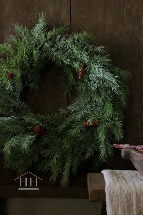 Dieser künstliche Kranz aus Zedernholz hat einen Durchmesser von ca. 70 cm.