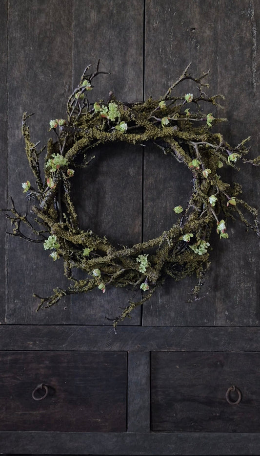 Künstlicher Mooskranz mit weißen Blütenzweigen