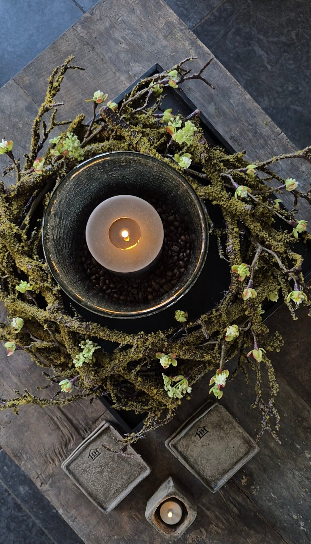 Künstlicher Mooskranz mit weißen Blütenzweigen
