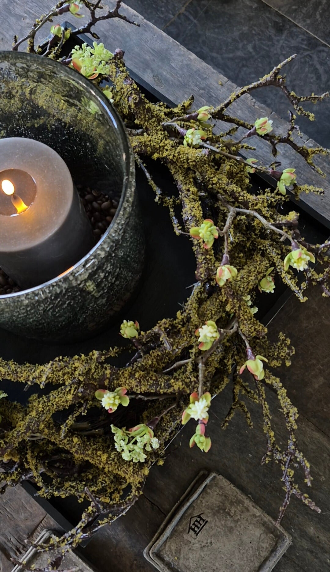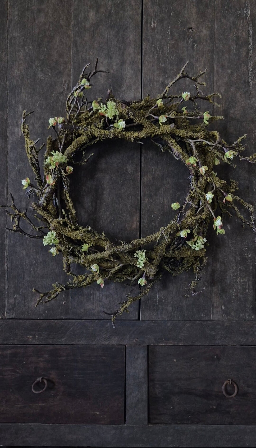 Dieser künstliche Mooskranz hat grobe Äste und ist mit Blütenzweigen gestaltet. Der Kranz hat einen Durchmesser von 40-42cm. Mit den Auslegern ist der Kranz 50-55cm.