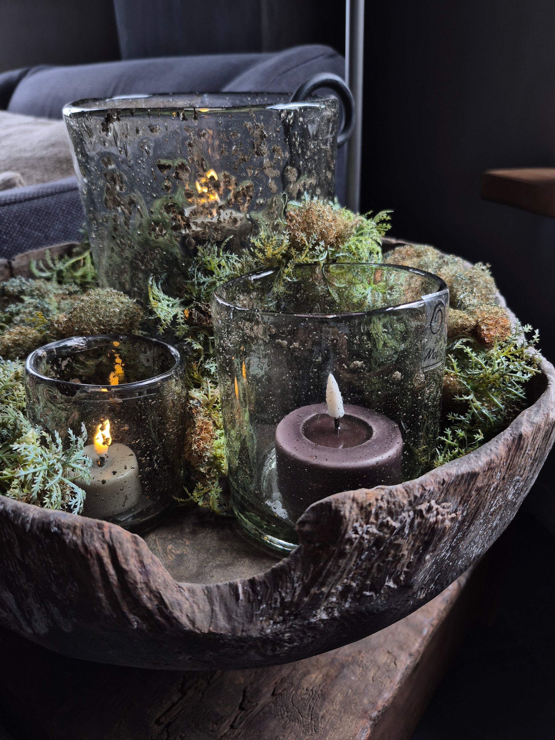 Sie werden einzeln verkauft und haben jeweils eine einzigartige Form. Auf dem ersten Foto sind drei Moosstücke um die Laternen angeordnet. Einmal ist das Moos länglicher, einmal runder. Dieses künstliche Moos hat eine graugrüne Farbe mit Brauntönen.