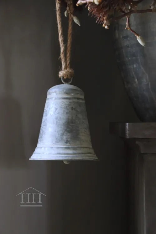 Een grijs metalen bel met een diameter van 15cm op z'n breedst en 19 cm hoog.