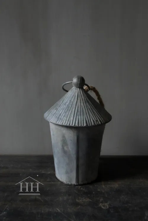 Ein graues Zink-Vogelhaus mit einer Höhe von 20 cm ohne Ring und Seil und einer Gesamtbreite von 13 cm.
