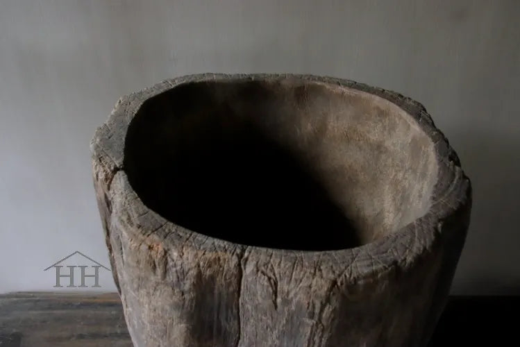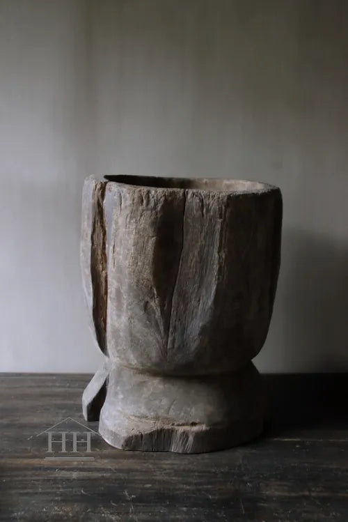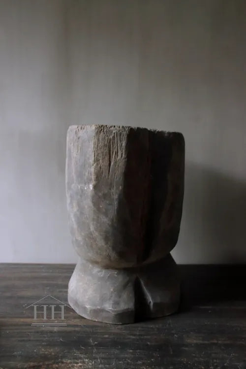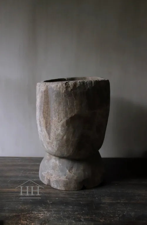 Ein verwitterter, einzigartiger asiatischer Mörser mit einem Durchmesser von etwa 28–32 cm an der breitesten Stelle.