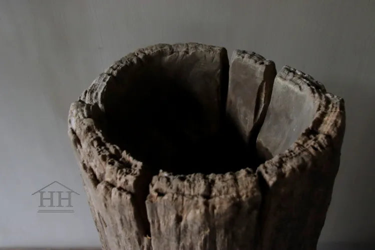 Ein verwitterter, einzigartiger, schmaler asiatischer Mörser mit einem Durchmesser von etwa 21–23 cm an der breitesten Stelle.
