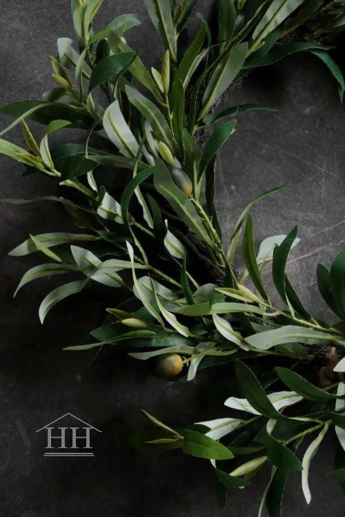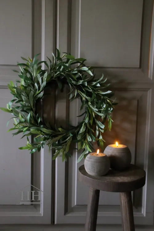 Een krans van groene kunst olijftakken op een bruine basiskrans.