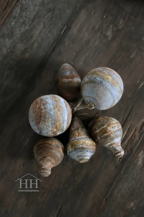 Een set van 6 metalen kersthangers. De touwtjes aan de hangers zijn verschillend.