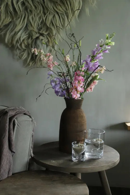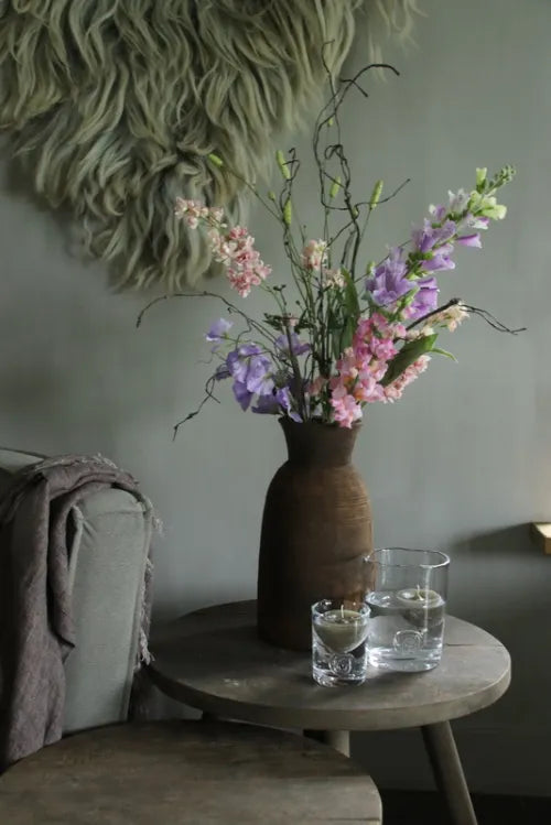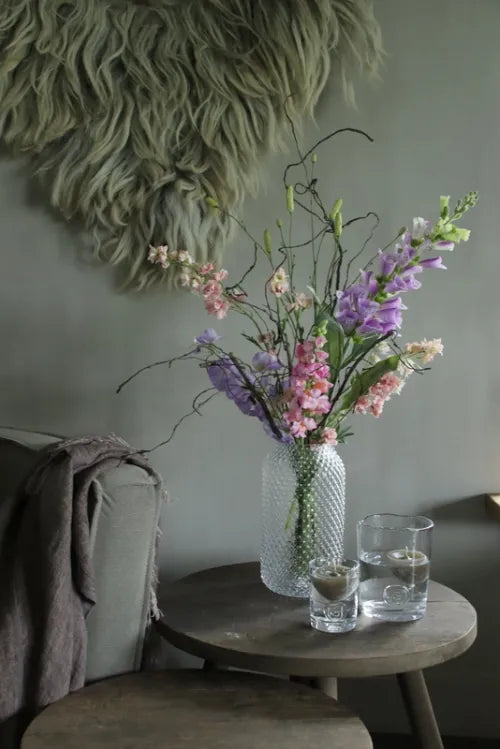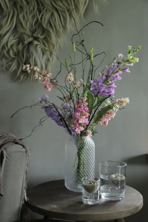 The artificial flowers are delivered separately in a box. The stems are bendable and easy to assemble. The vase is available separately in the webshop.