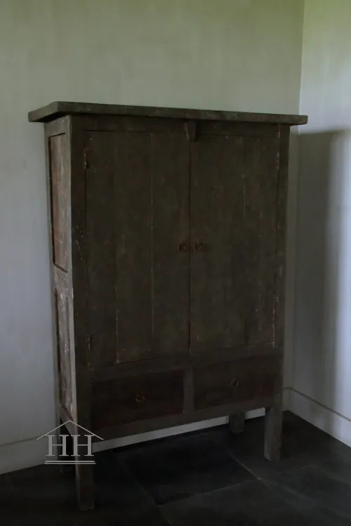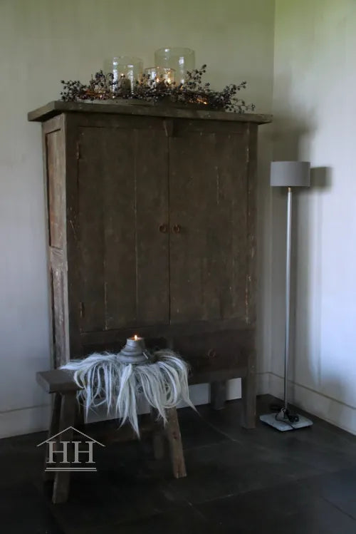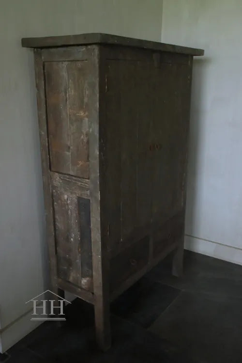 A cabinet made of old wood by Aura Peeperkorn. The wood has a weathered look and a nice size, making it a beautiful eye-catcher in the interior. The cabinet has a width of 80 cm, depth of 45 cm and is 140 cm high.