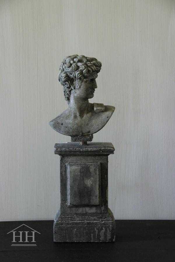 Dit stoere betonnen beeldje David op console/sokkel is 37 cm hoog, 12 cm breed en 7,5 cm diep.