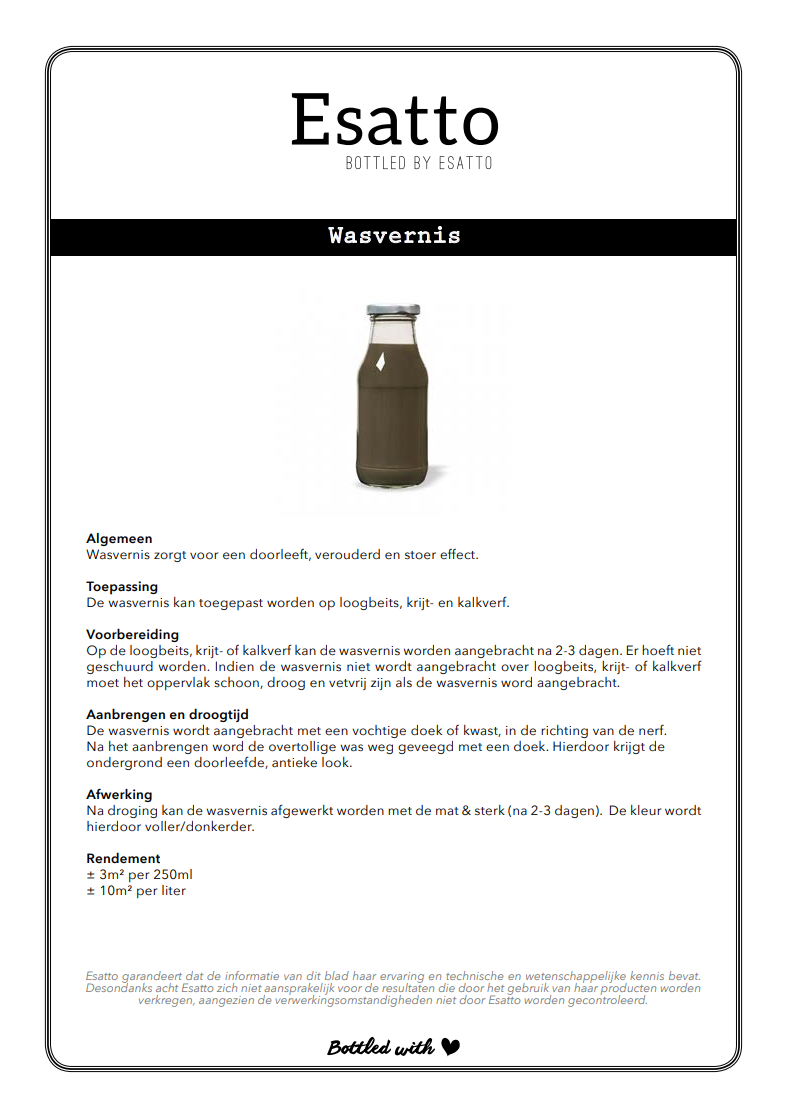 Wasvernis is ideaal voor keukenkasten, meubelen, lambriseringen, trappen, houten vloeren, tuinmeubelen en vloerdelen. De wasvernis kan toegepast worden op loogbeits, krijt- en kalkverf. Het is altijd verstandig om eerst op een onderkant of zijkant een stukje te testen.