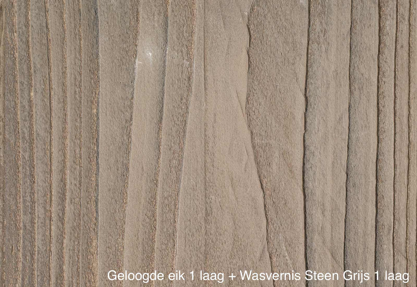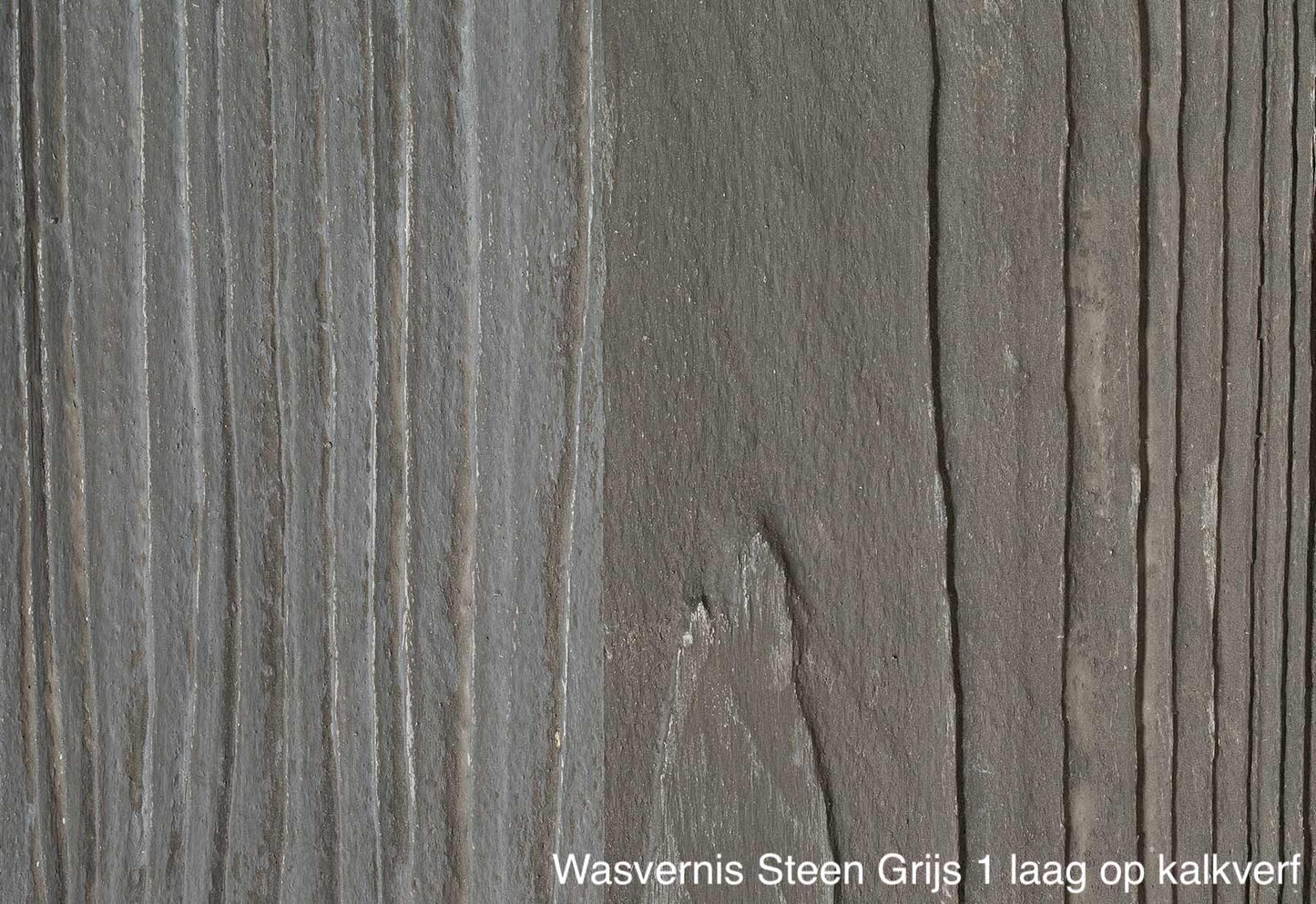 Op de krijtverf foto zie je rechts onbewerkt en links zie je krijtverf dat 1x is bewerkt met steen grijs wasvernis.