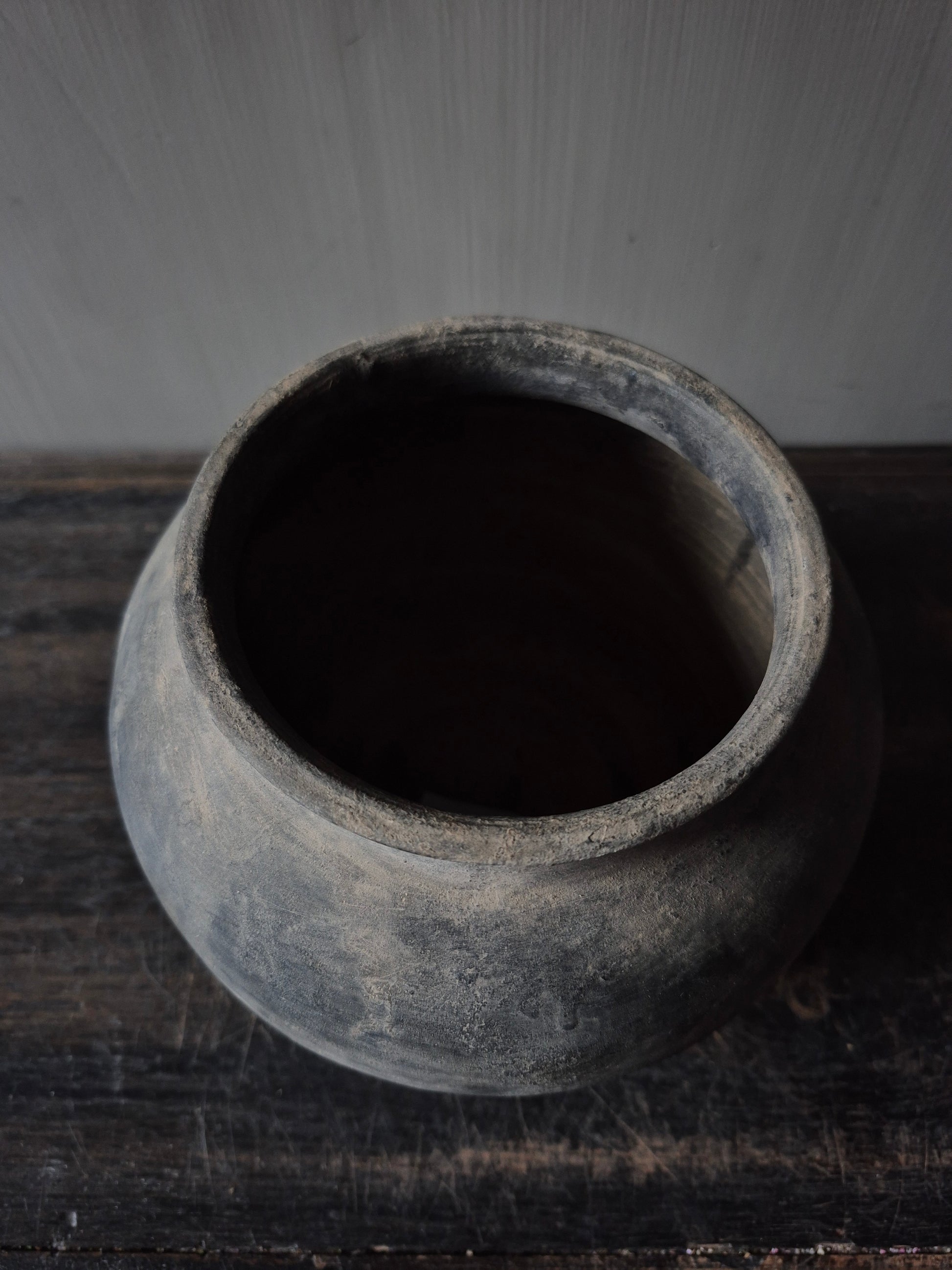 Een grijs kleurig terracotta kruikje met een hoogte van 14,5cm en 16,5cm op z'n breedst.