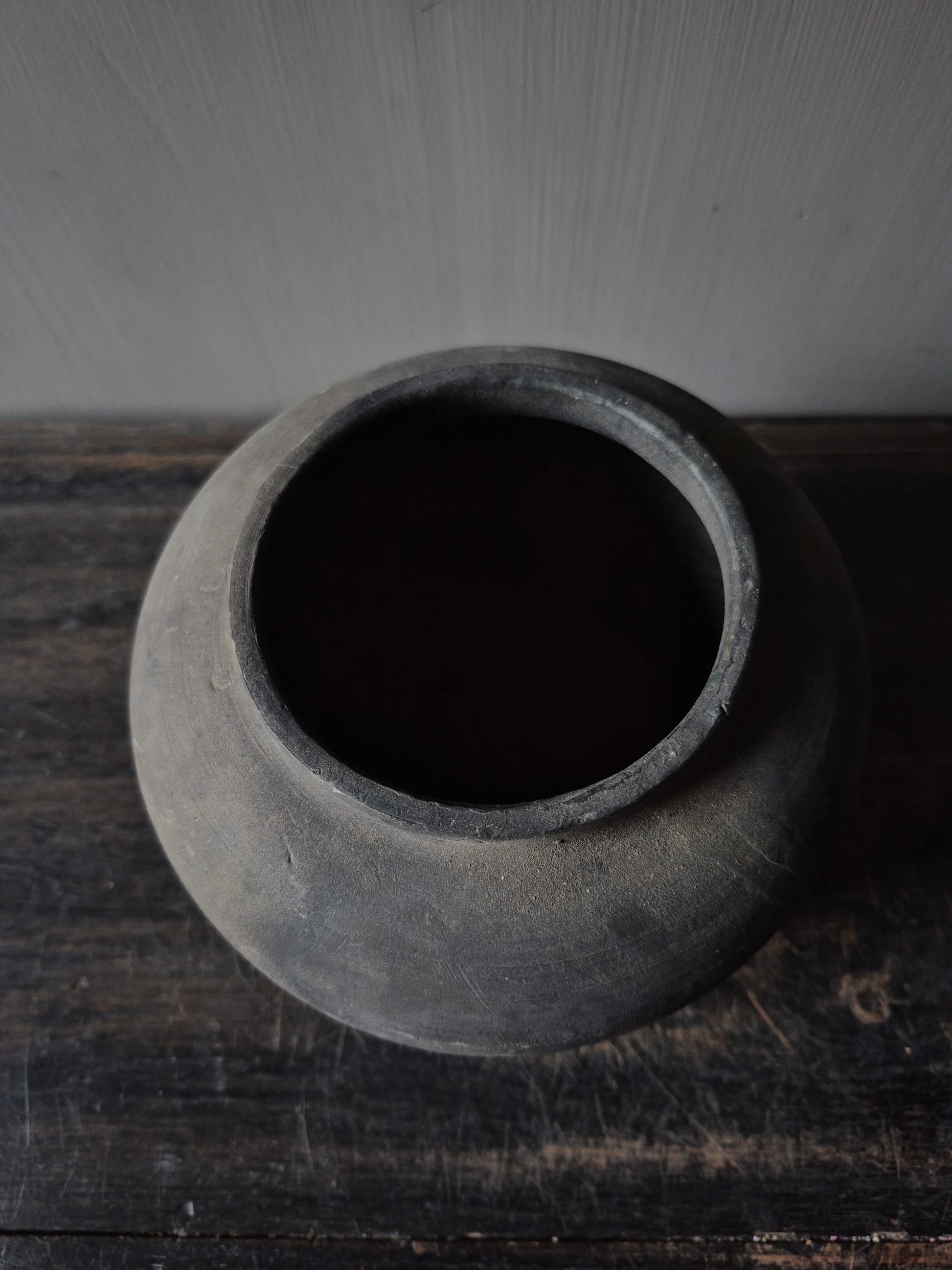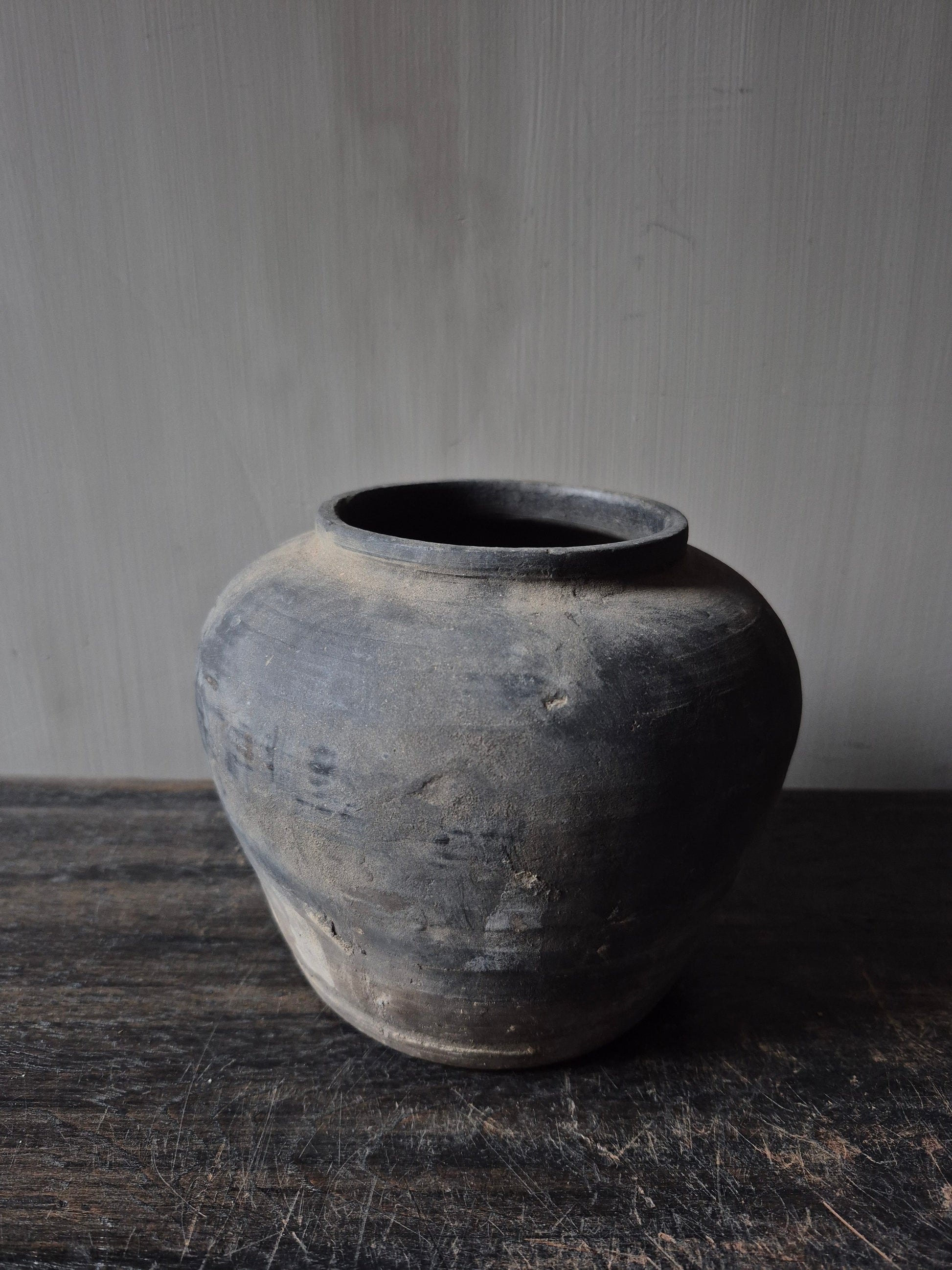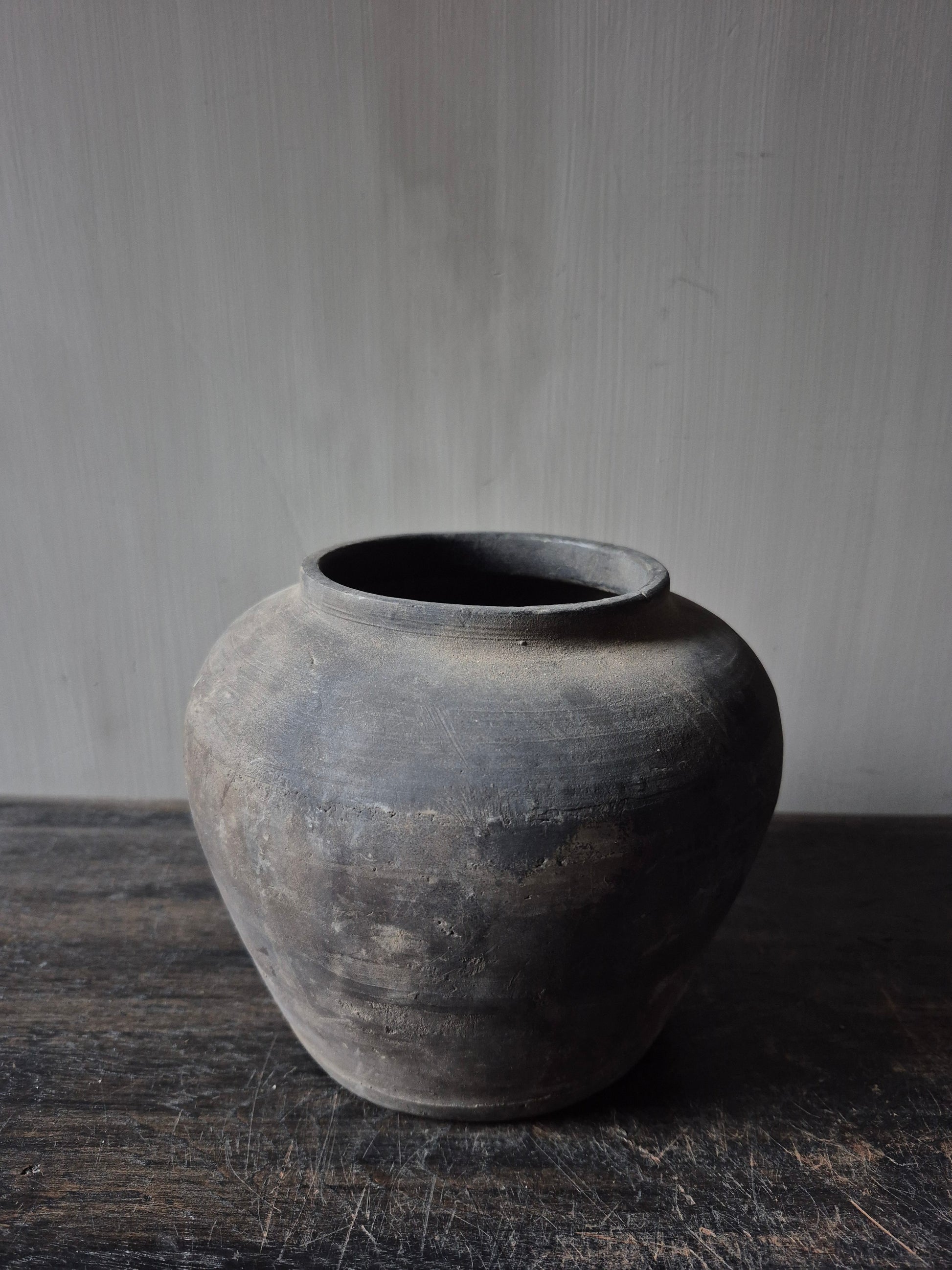 Een grijs kleurig terracotta kruikje met een hoogte van 15cm en 17cm op z'n breedst.