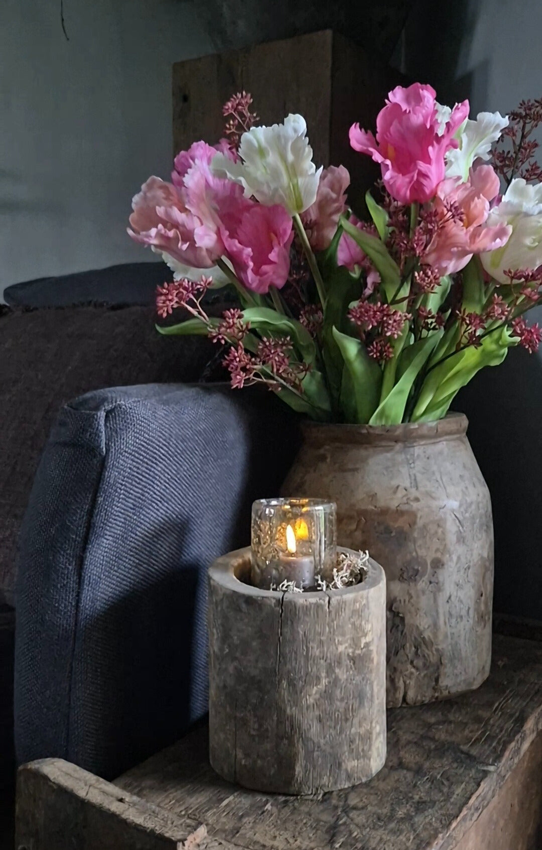 Een houten unieke pot/kruik met een diameter van 22x19,5cm en 28 cm hoog. In de kruik zitten barstjes en deukjes, dit hoort erbij.