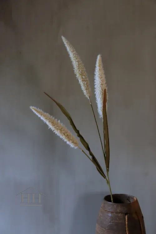 Lampepoetser gras van 93cm met 3 levendige, creme pluimen. Leuk om er een paar in een pot/kruik/vaas te zetten. Ook mooi voor buiten onder een overkapping/veranda.