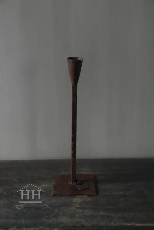 Een ijzeren kandelaar met een roestige patina van Aura Peeperkorn. Het betreft hier het laagste model (linker kandelaar). De kandelaar heeft hoogte van 25 cm en de voet is 8x8cm . Er past 1 Led- of gewone kaars in van normaal formaat. Maar ook de kerstboomkaarsjes die wat lager zijn staan er mooi in als je ze wat vast zet met tillandsia of mos.