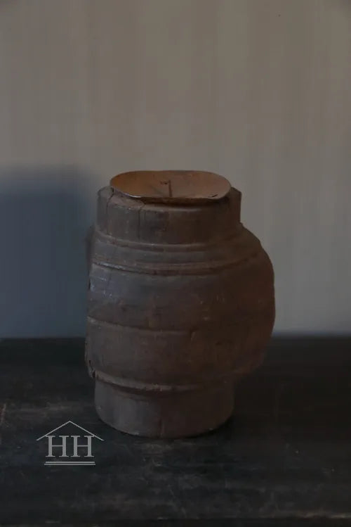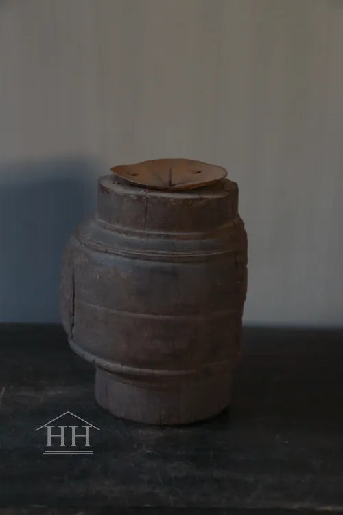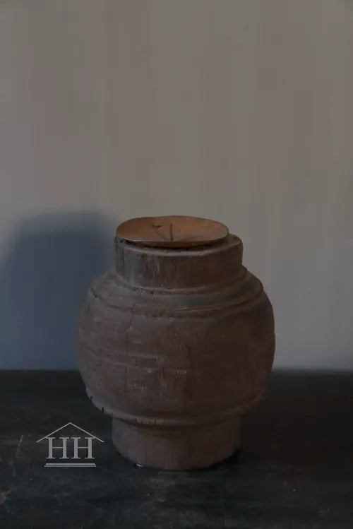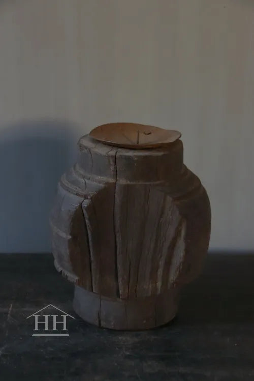 Een oude, houten kandelaar met een hoogte van 15,5 cm en een diameter van 14cm op z'n breedst. Het betreft hier de kandelaar links op de foto.