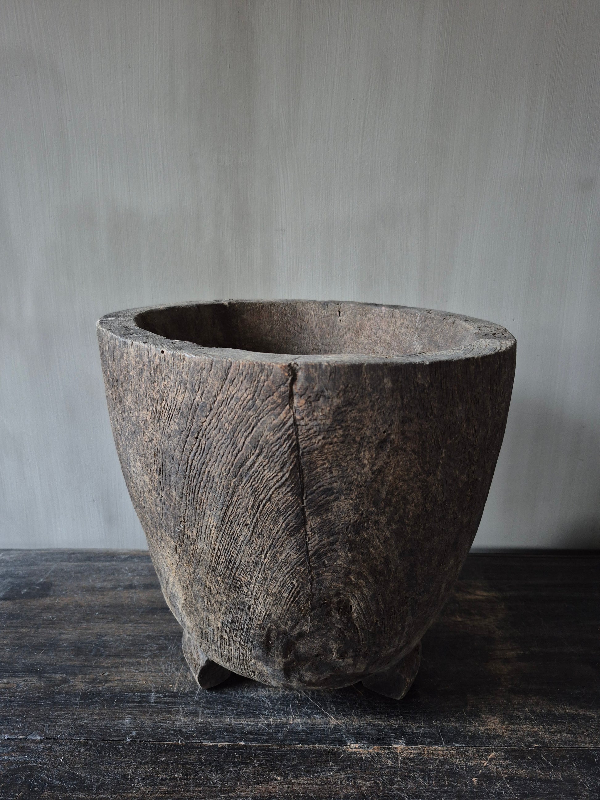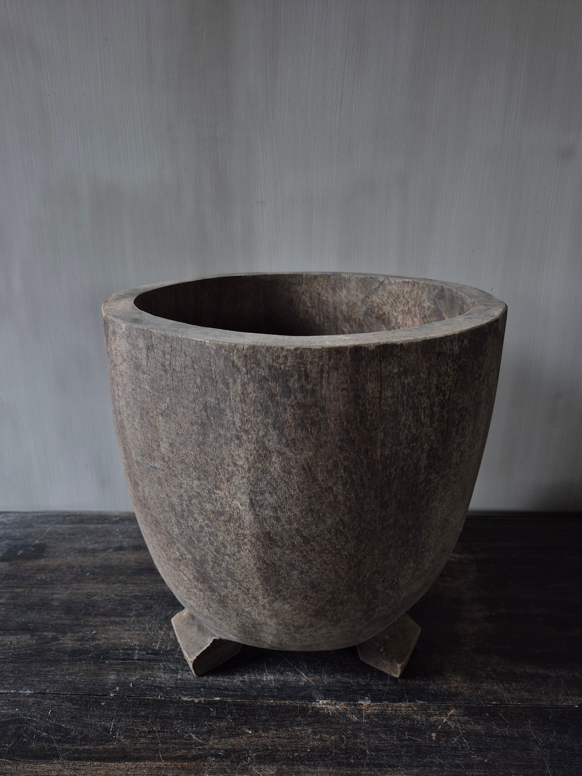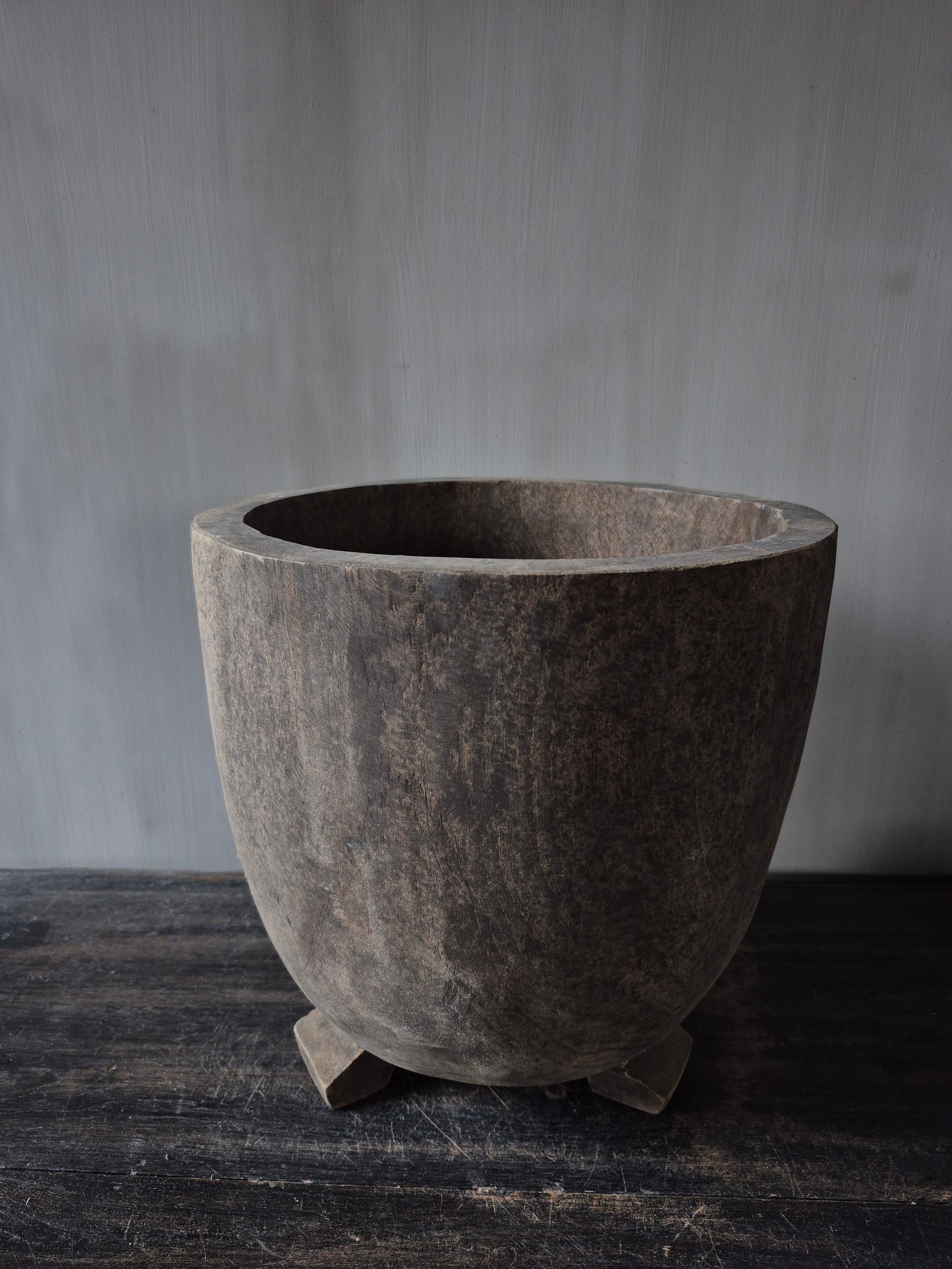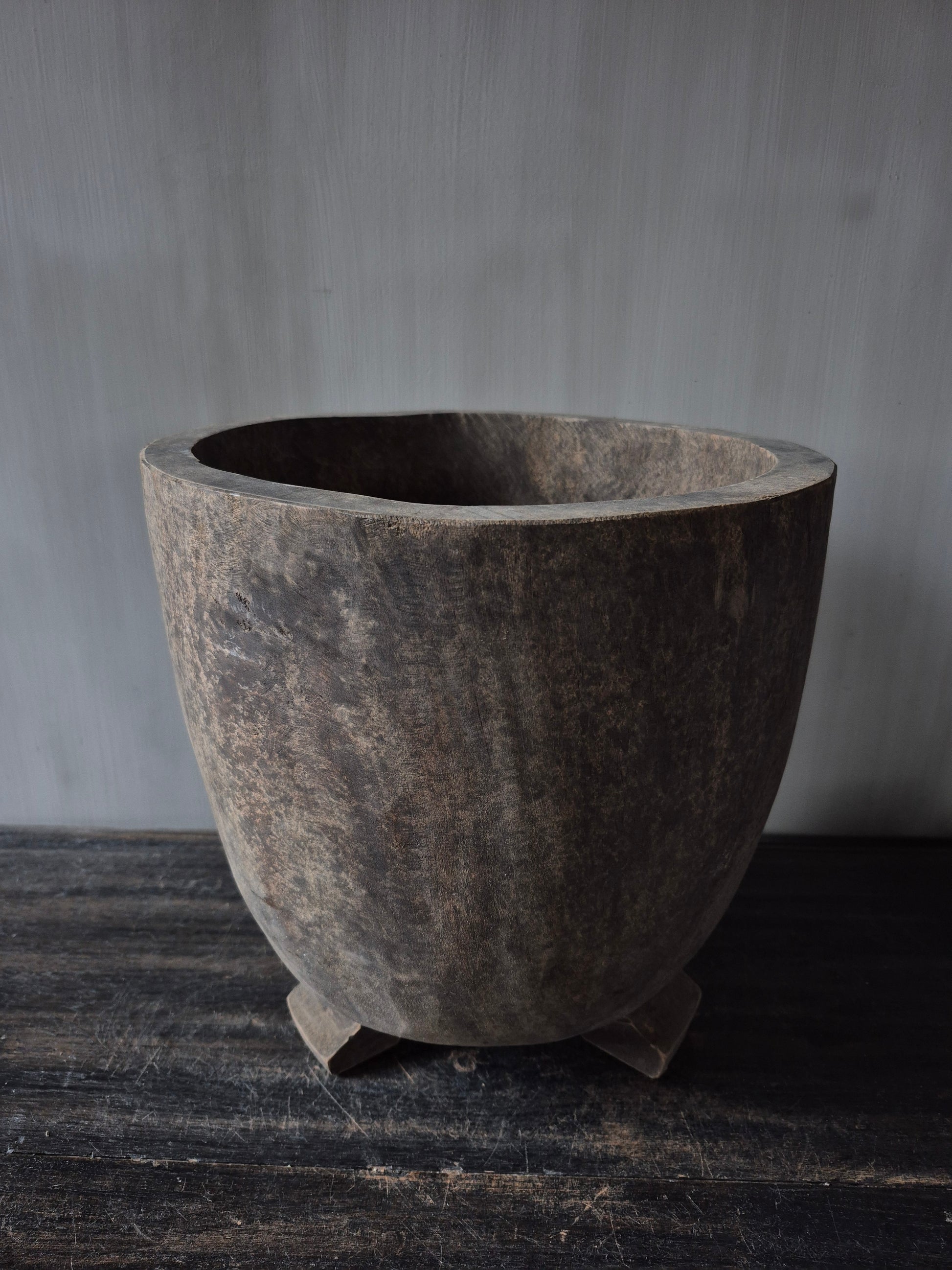 Een vergrijsde vijzel / pot van Luksa met een diameter van ongeveer 29,5-31 cm op z'n breedst.